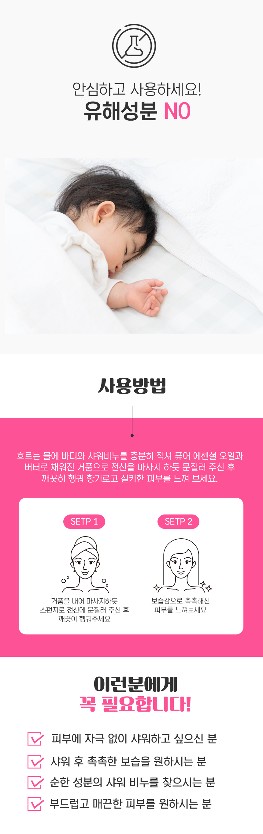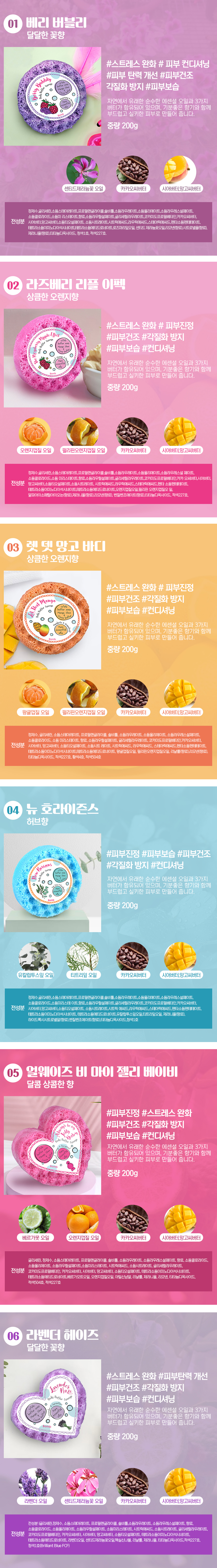 | 사용방법 | 흐르는 물에 바디와 샤워버퍼스펀지 비누를 충분히 적셔 퓨어 에센셜 오일과 버터로 채워진 거품으로 전신을 마사지 하듯 문질러 주신 후 깨끗히 헹궈 향기롭고 실키한 피부를 느껴 보세요 |
