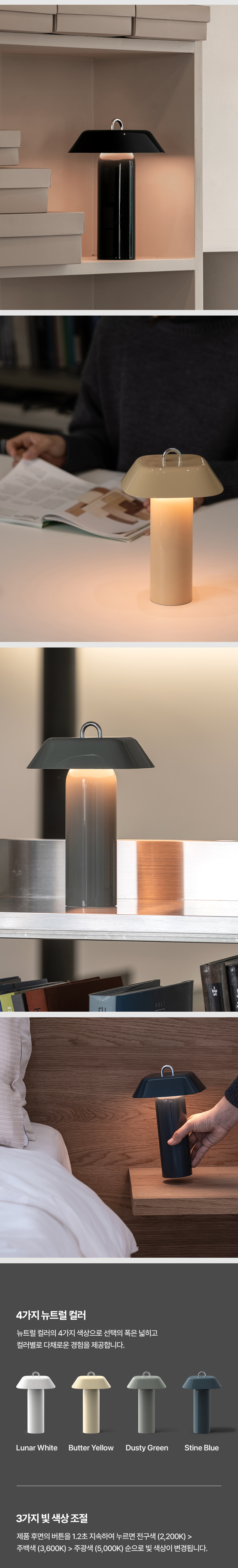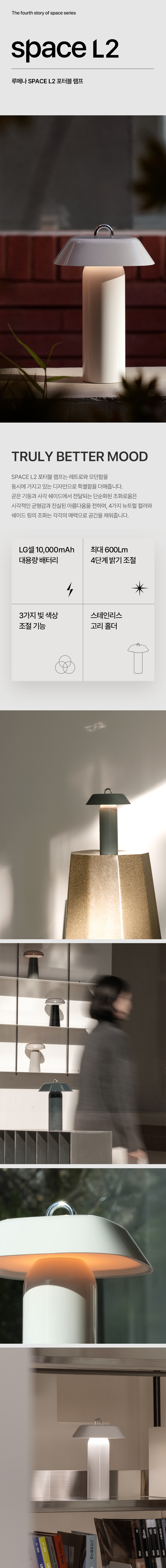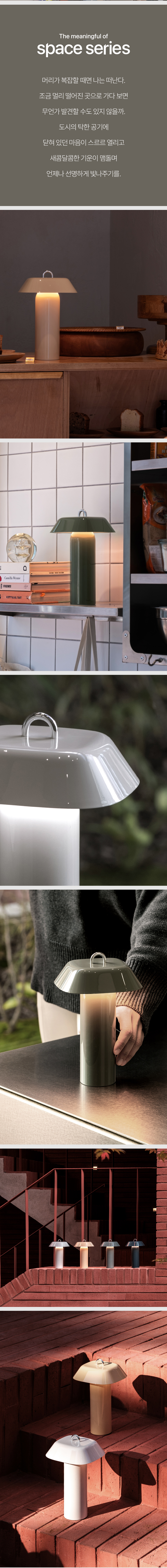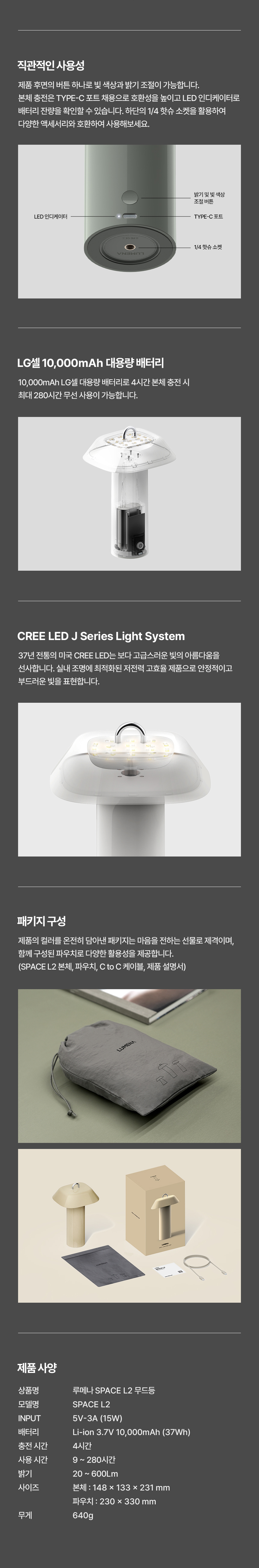- 감성적으로 서서히 변화하는 FADE IN/OUT 밝기/색온도 조절 (SPACE ON 조절효과 동일) - 메탈 소재의 일체형 고리로 디자인 포인트 & 걸이식 사용성 - 유광 하이그로시 마감으로 발광 시 바디를 타고 반사되는 고급스러운 발광 효과 구현 - 사용 환경에 맞추어 다양한 연출이 가능한 3가지 색온도 및 밝기 세팅 - 범용성 높은 Type-C Input Port 채용 - 제품 하단 1/4인치 나사산(핫슈) 구조 삽입하여 아웃도어에서도 다양한 ACC 거치 가능 |
