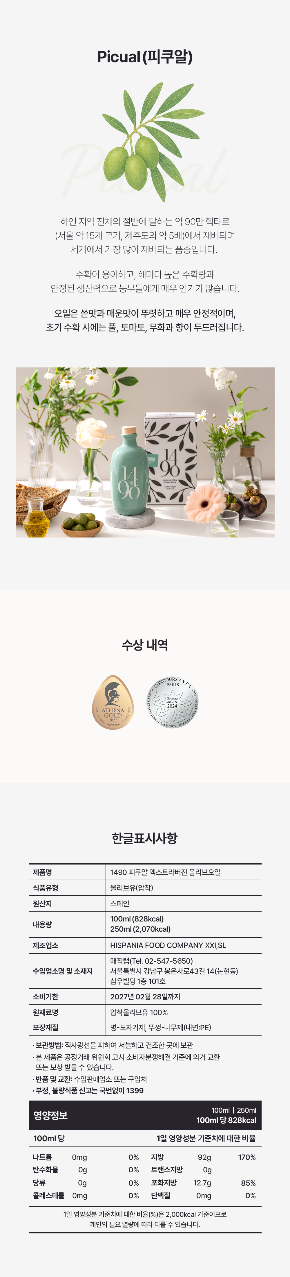 | 원재료명 및 함량 | 압착올리브유 100% |